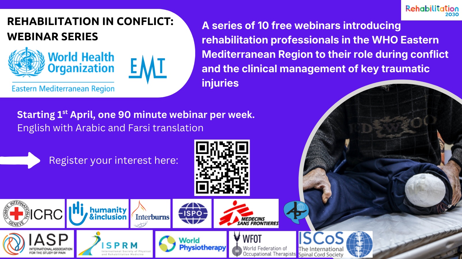 In collaboration with other leading rehabilitation organisations from around the world, a series of weekly webinars will be offered for rehabilitation professionals working in conflict affected countries, targeting the Eastern Mediterranean Region. The webinar series, hosted by the WHO Eastern Mediterranean Regional Office, will include translation in Arabic and Farsi, and will cover 10 topics covering the role of rehabilitation professionals during conflict and the rehabilitation of key conflict related injuries.